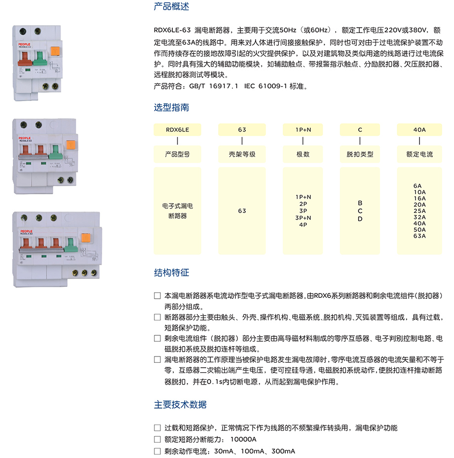 RDX6LE-63漏电断路器,主要用于交流50Hz(或60Hz),额定工作电压220V或380V,额定电流至63A的线路中。用来对人体进行间接接触保护,同时也可对由于过电流保护装置不动作而持续存在的接地故障引起的火灾提供保护,以及对建筑物及类似用途的线路进行过电流保护。同时具有强大的辅助功能模块,如辅助触点、带报警指示触点、分励脱扣器、欠压脱扣器、远程脱扣器测试等模块。