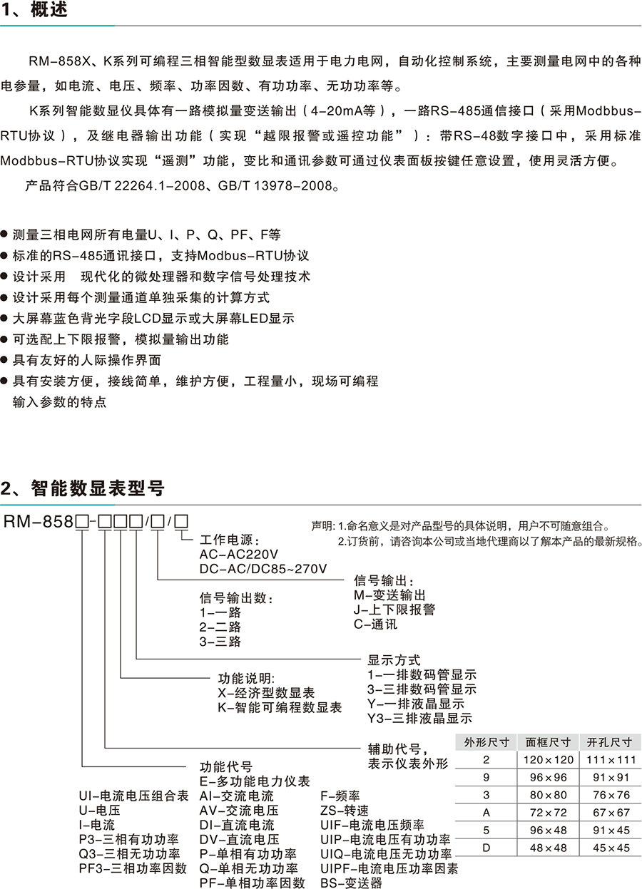 RM-858E系列多功能电力仪表是针对电力系统、工矿企业、公共设施、智能大厦等电力监控、智能控制、计量考核的应用场合设计的高精度、高可靠、高性价比的智能配电仪表产品。该系列仪表采用高精度专用计量芯片和高可靠的MCU设计,可以同时测量三相电网中所有常用电量参数:三相电压(相/线)、三相电流、有功功率、无功功率、功率因数、电网频率、UIPQ需量和双向电能计量,具有标准电能脉冲输出和RS485通讯接口,可选多种扩展功能模块。