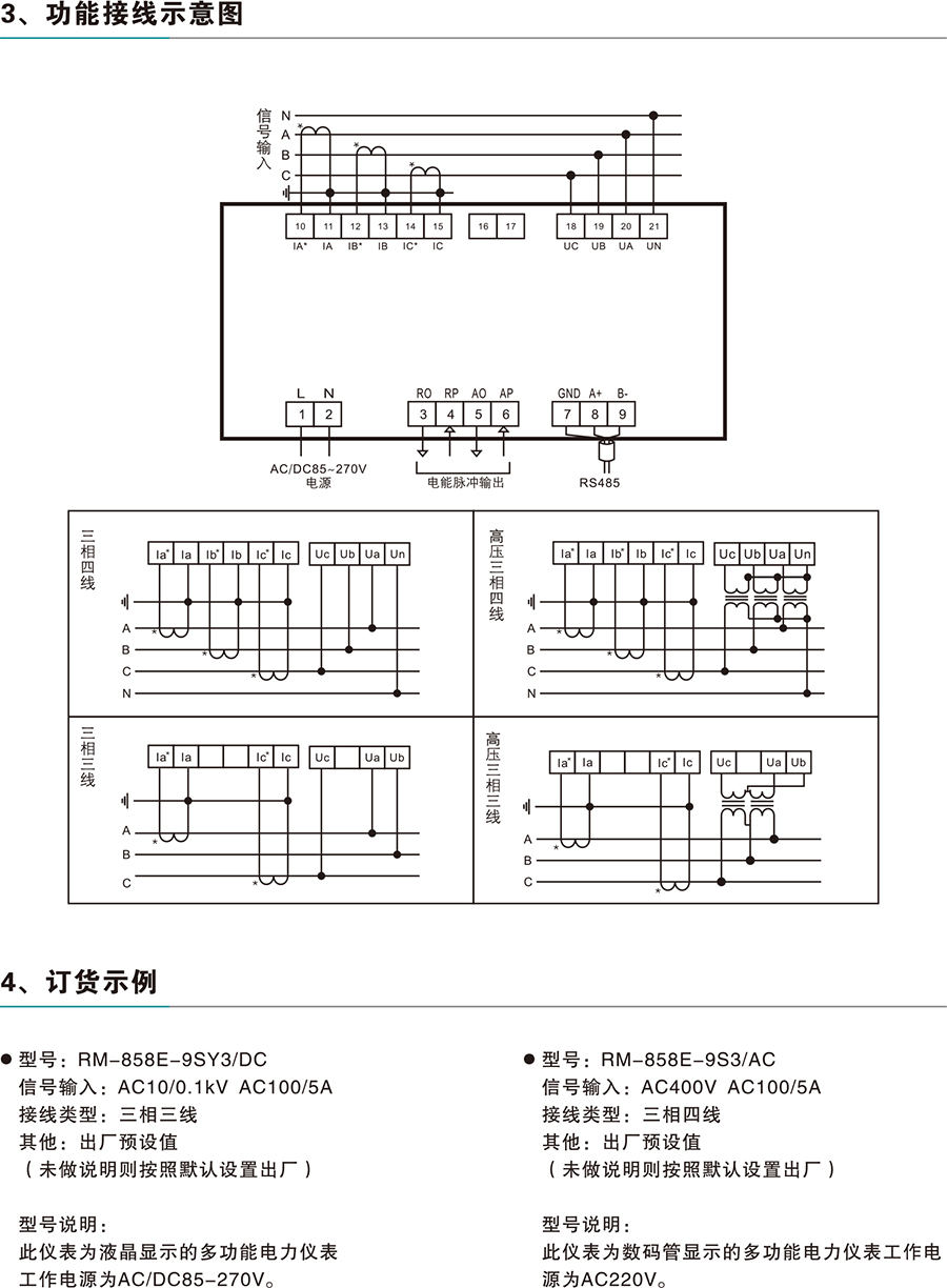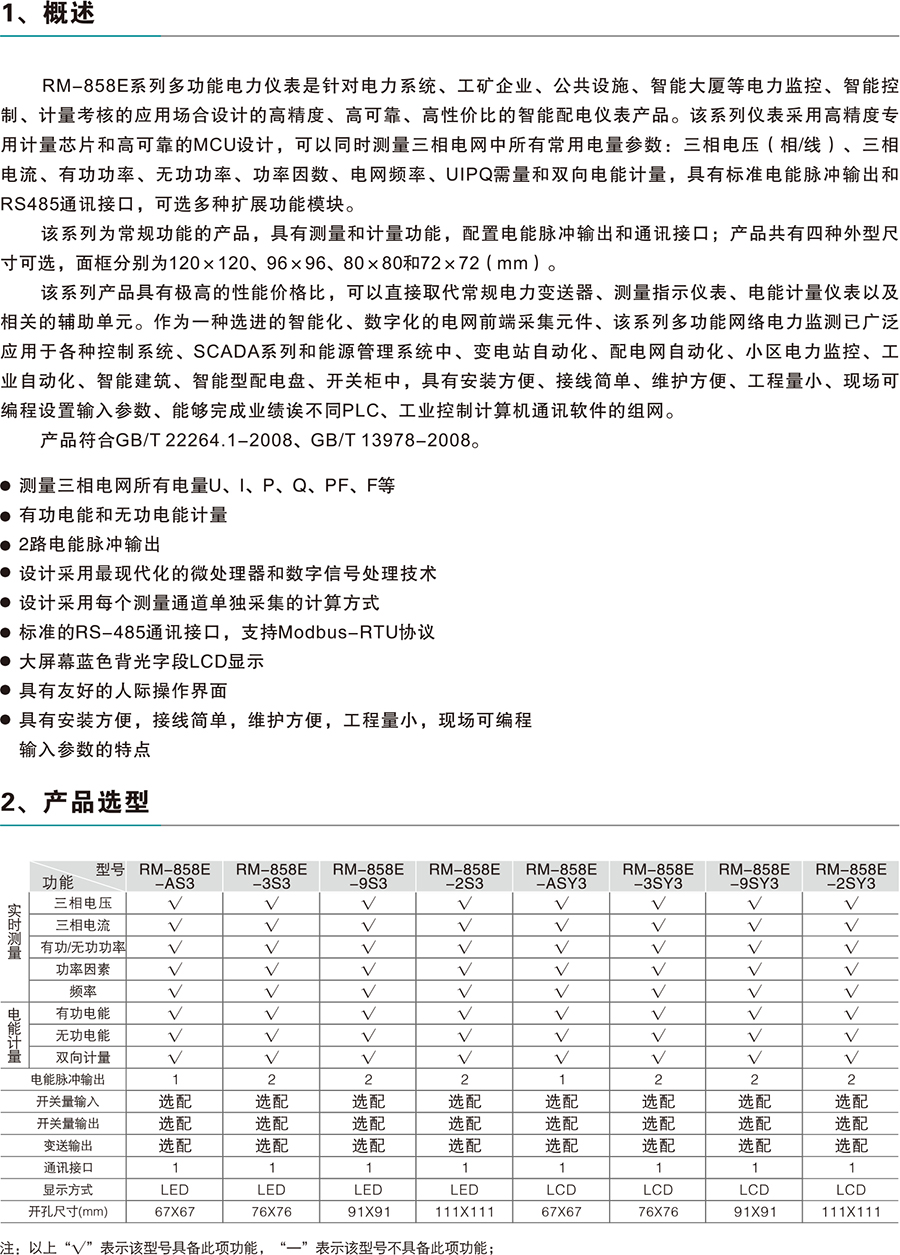 RM-858E系列多功能电力仪表是针对电力系统、工矿企业、公共设施、智能大厦等电力监控、智能控制、计量考核的应用场合设计的高精度、高可靠、高性价比的智能配电仪表产品。该系列仪表采用高精度专用计量芯片和高可靠的MCU设计,可以同时测量三相电网中所有常用电量参数:三相电压(相/线)、三相电流、有功功率、无功功率、功率因数、电网频率、UIPQ需量和双向电能计量,具有标准电能脉冲输出和RS485通讯接口,可选多种扩展功能模块。