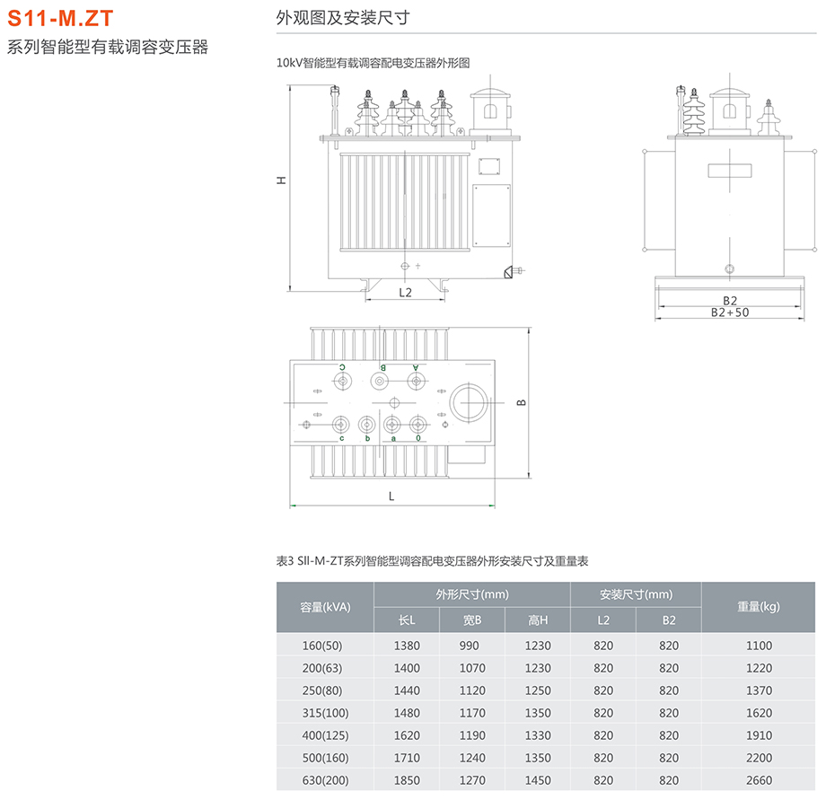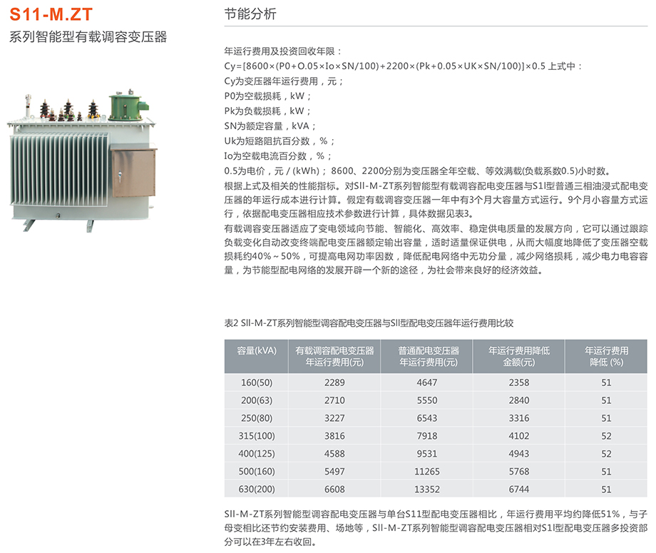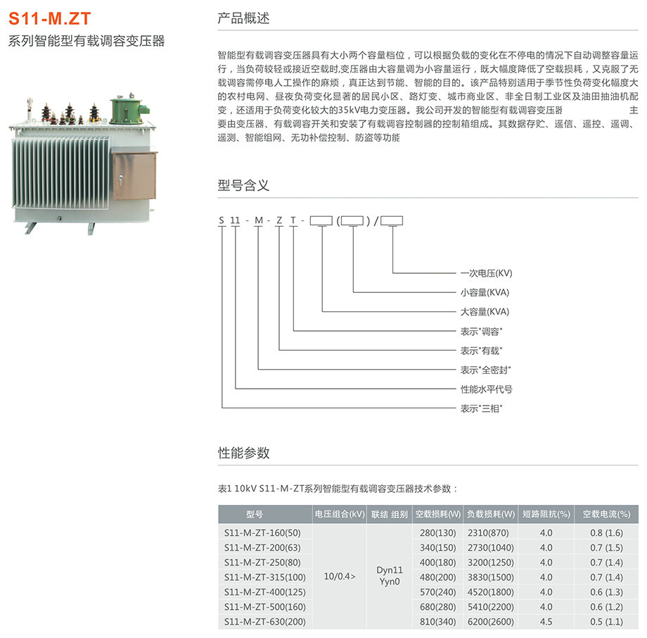智能型有载调容变压器具有大小两个容量档位,可以根据负载的变化在不停电的情况下自动调整容量运行,当负荷较轻或接近空载时,变压器由大容量调为小容量运行,既大幅度降低了空载损耗,又克服了无载调容需停电人工操作的麻烦,真正达到节能、智能的目的。该产品特别适用于季节性负荷变化幅度大的农村电网、昼夜负荷变化显著的居民小区、路灯变、城市商业区、非全日制工业区及油田抽油机配变,还适用于负荷变化较大的35kV电力变压器。型有载调容变压器主要由变压器、有载调容开关和安装了有载调容控制器的控制箱组成。其数据存贮、遥信、遥控、遥调、遥测、智能组网、无功补偿控制、防盗等功能。