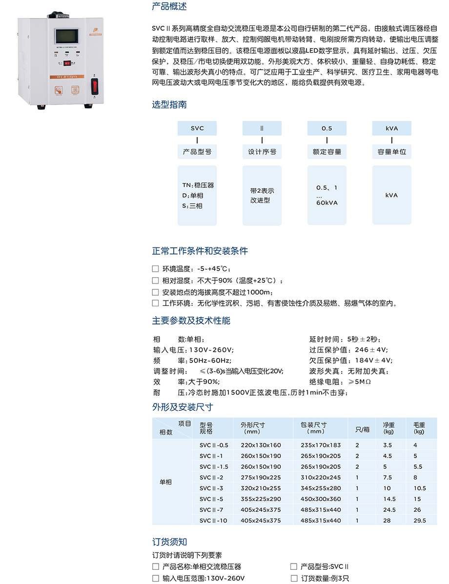 SVCll系列高精度全自动交流稳压电源是第二代产品,由接触式调压器经自动控制电路进行取样、放大、控制伺服电机带动转臂、电刷按所需方向转动,使输出电压调整到额定值而达到稳压目的。该稳压电源面板以液晶LED数字显示,具有延时输出、过压、欠压保护,及稳压/市电切换使用双功能。外形美观大方、体积较小、重量轻、自身功耗低、稳定可靠、输出波形失真小的特点。可广泛应用于工业生产、科学研究、医疗卫生、家用电器等电网电压波动大或电网电压季节变化大的地区,能给负载提供有效电源。