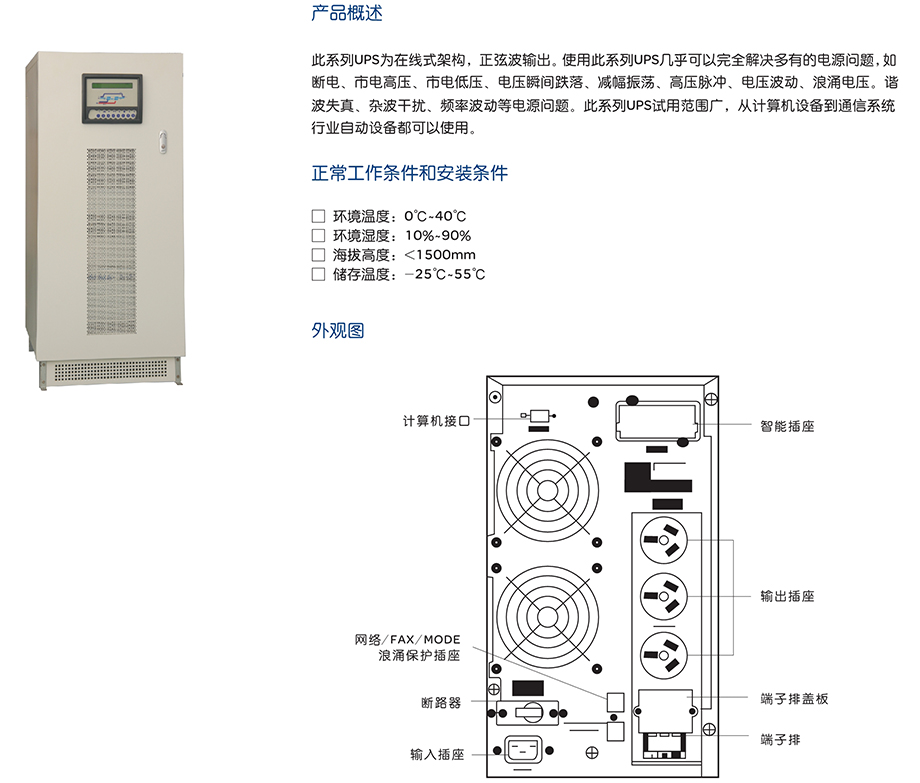 此系列UPS为在线式架构,正弦波输出。使用此系列UPS几乎可以完全解决多有的电源问题,如断电、市电高压、市电低压、电压瞬间跌落、减幅振荡、高压脉冲、电压波动、浪涌电压。谐波失真、杂波干扰、频率波动等电源问题。此系列UPS试用范围广,从计算机设备到通信系统行业自动设备都可以使用。
