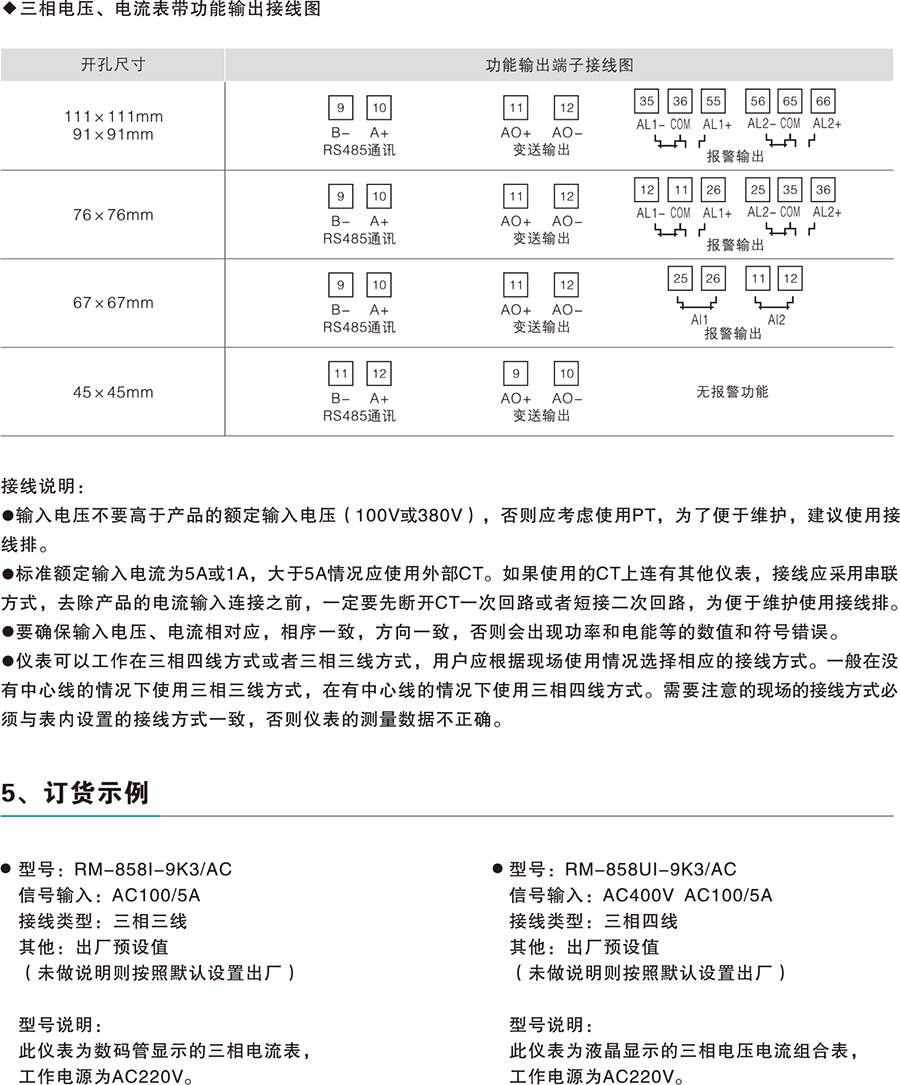 RTU协议),及继电器输出功能(实现“越限报警或遥控功能”):带RS-48数字接口中,采用标准Modbbus-RTU协议实现“遥测”功能,变比和通讯参数可通过仪表面板按键任意设置,使用灵活方便。
