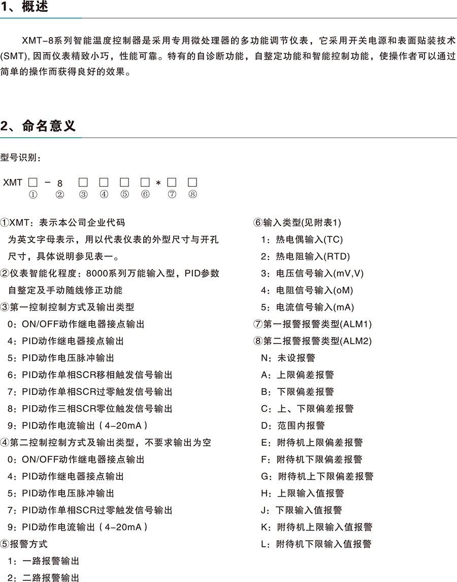 XMT-8系列智能温度控制器是采用专用微处理器的多功能调节仪表,它采用开关电源和表面贴装技术(SMT),因而仪表精致小巧,性能可靠。有自诊断功能,自整定功能和智能控制功能,使操作者可以通过简单的操作而获得良好的效果。