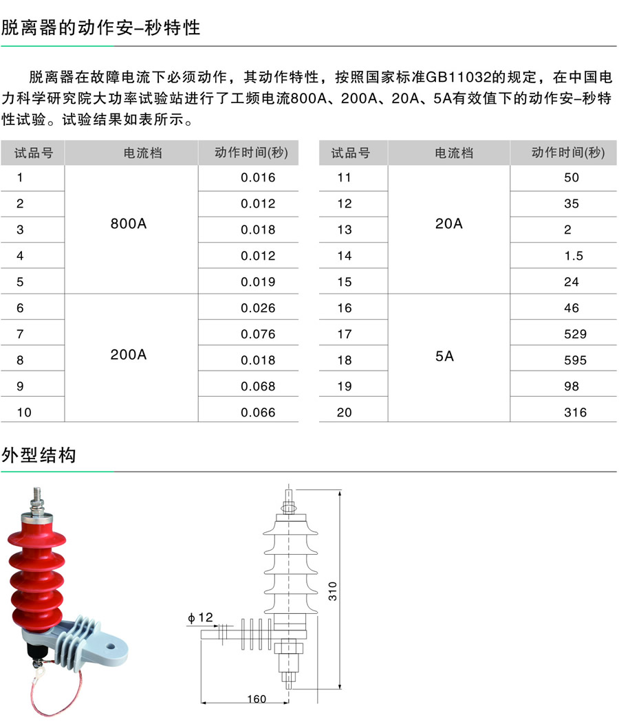 | 3~10kV带脱离器复合外套金属氧化避雷器配有专用的绝缘托架和安装支架,脱离器上螺栓直接与避雷器底部相连,脱离器的下螺栓连接地线。 避雷器带脱离器的目的是当避雷器在异常情况下发生故障时,工频短路电流使脱离器动作,脱离器接地端自动脱开,使故障的避雷器与系统脱离,并表明故障避雷器需要更换。为达到此目的,脱离器必须具有快速动作的特性和耐受规定电流冲击和动作负载的能力。 |