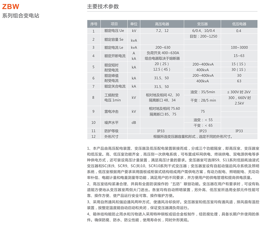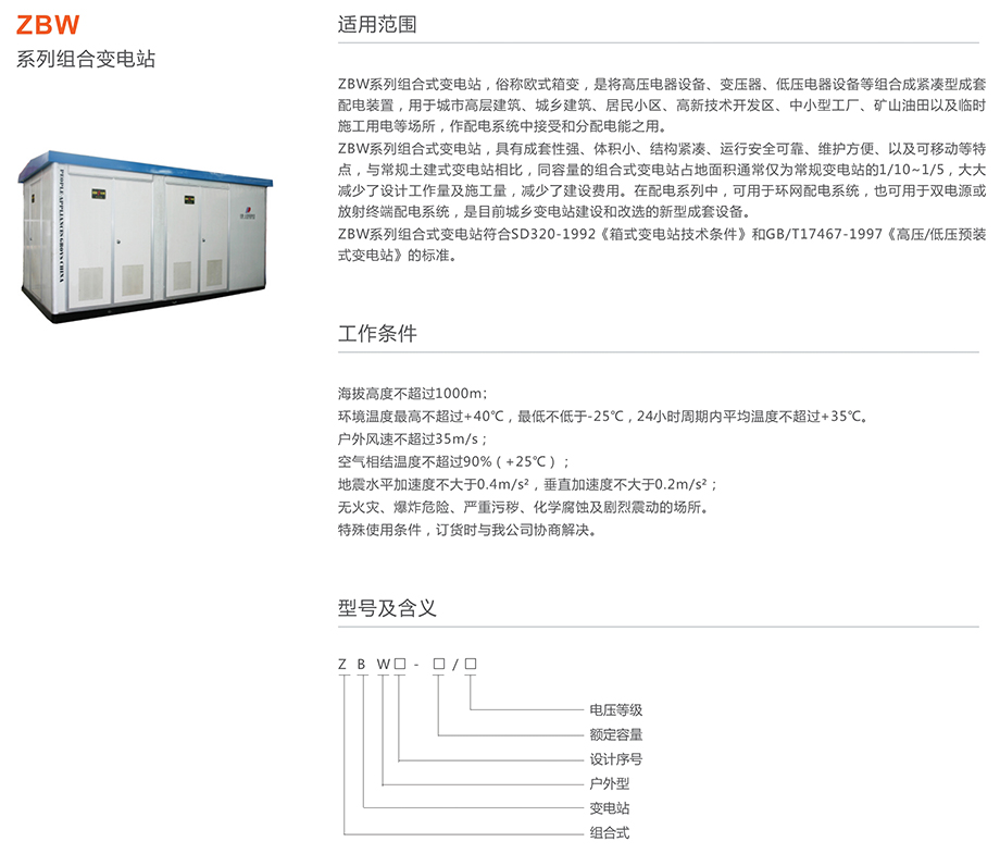 ZBW系列组合式变电站,俗称欧式箱变,是将高压电器设备、变压器、低压电器设备等组合成紧凑型成套配电装置,用于城市高层建筑、城乡建筑、居民小区、高新技术开发区、中小型工厂、矿山油田以及临时施工用电等场所,作配电系统中接受和分配电能之用。