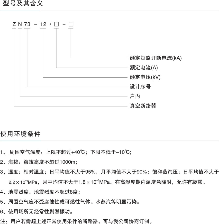 | ZN73-12型户内高压交流真空断路器(以下简称断路器)是三相交流50Hz,额定电压为12kV的户内装置,适用于投切各种不同性质的负荷及频繁操作的场合,可供工矿、企业、发电厂设备及变电站电气设施的保护和控制之用。 |