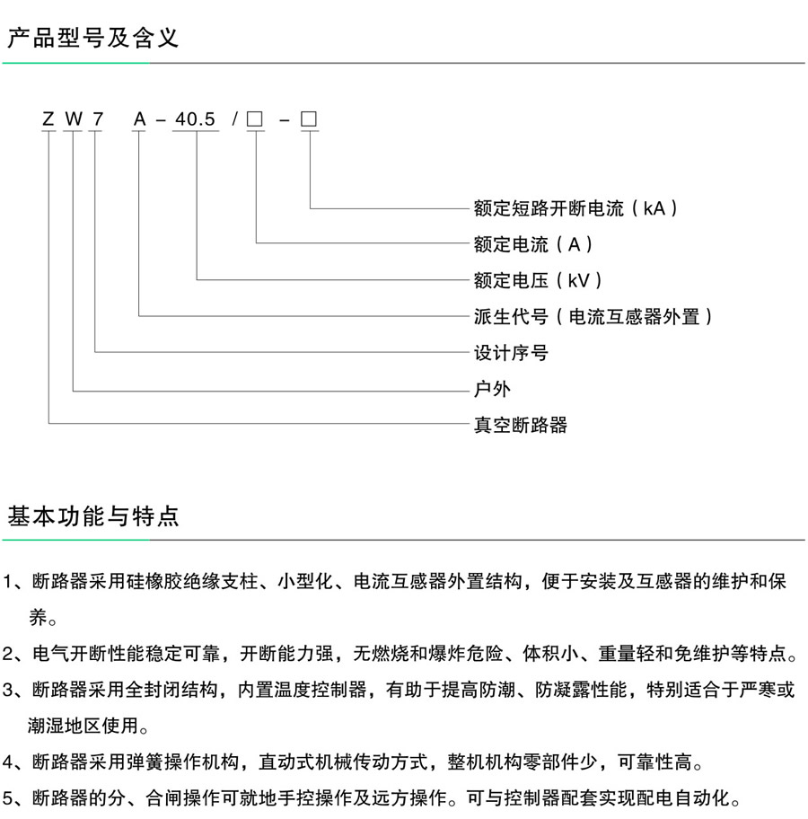 | ZW7A-12型户外高压交流真空断路器是额定电压40.5kV,50Hz三相交流的电流互感器外置式户外配电设备。主要用于配电网开断、关合电力系统中的负荷电流、过载电流及短路电流。适用于变电站及工矿企业配电系统中作保护和控制,适用于农村电网及频繁操作的场所,特别适用于城网、农网改造的需要。 |