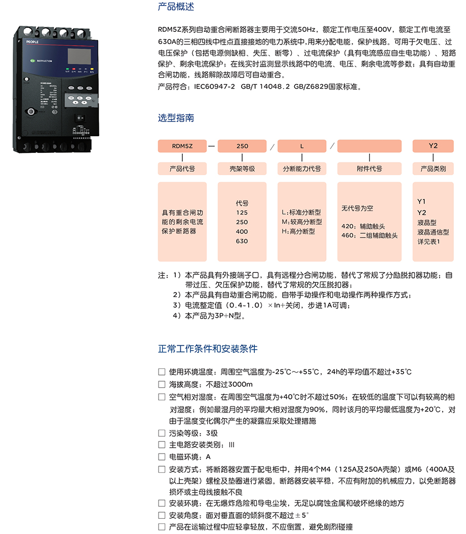 | RDM5Z剩余电流保护断路器(自动重合闸) | RDM5Z-125/L 50~125A液晶通讯型 |